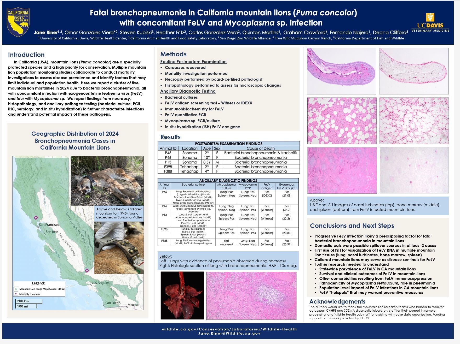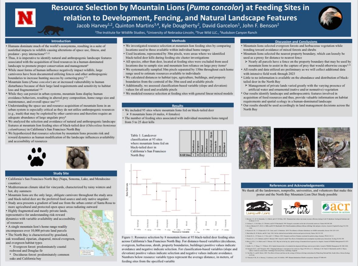1. Harvey, J. A., Martins, Q. E., Dougherty, K. K., Hettena, A. M., Garcelon, D. K., Benson, J. F. 2025. Functional Habitat Characteristics Influencing Spatial Variation in Mountain Lion Predation in a Human-dominated Landscape. Wildlife Society, Edmonton, AB (Oral).