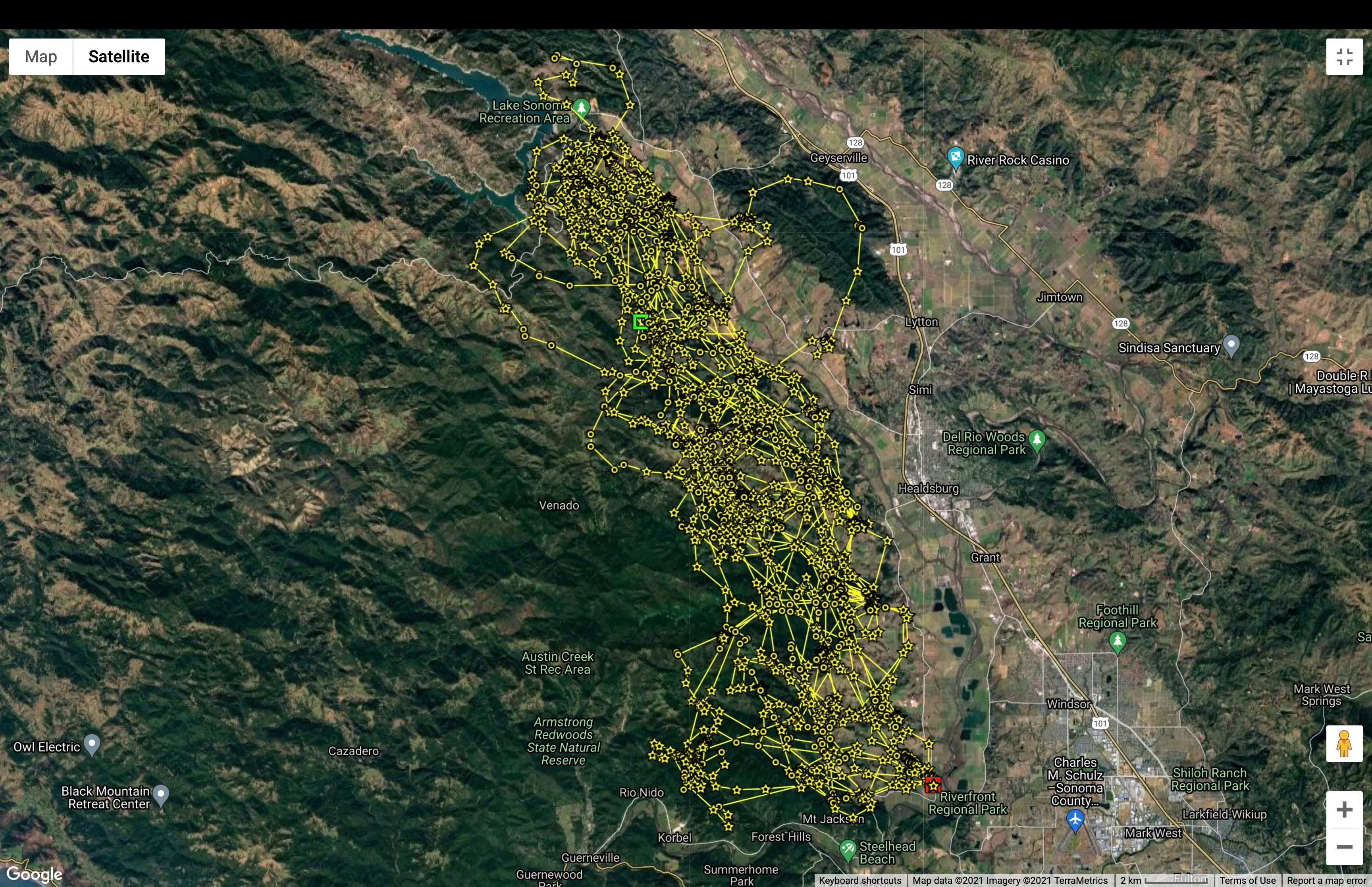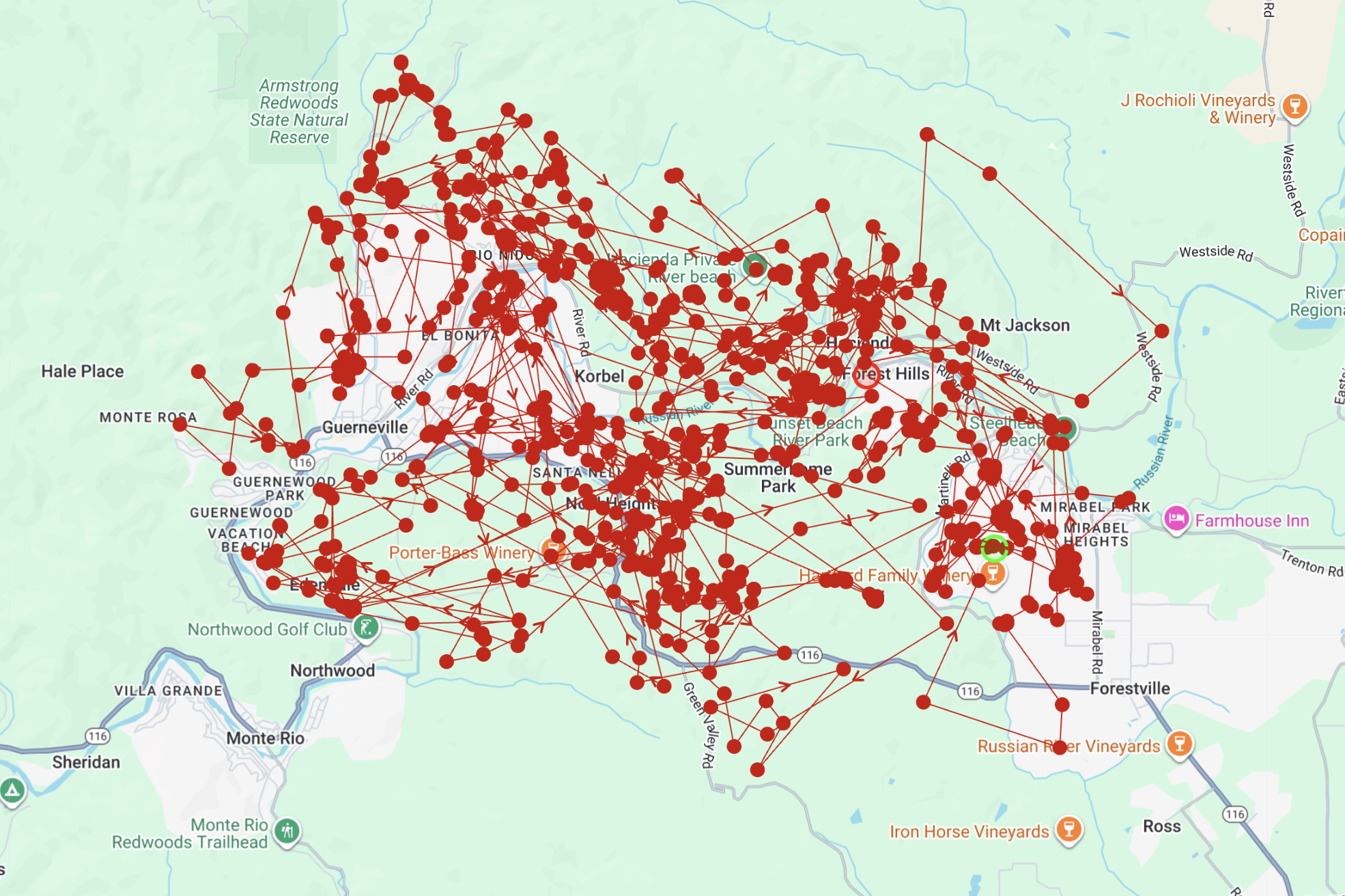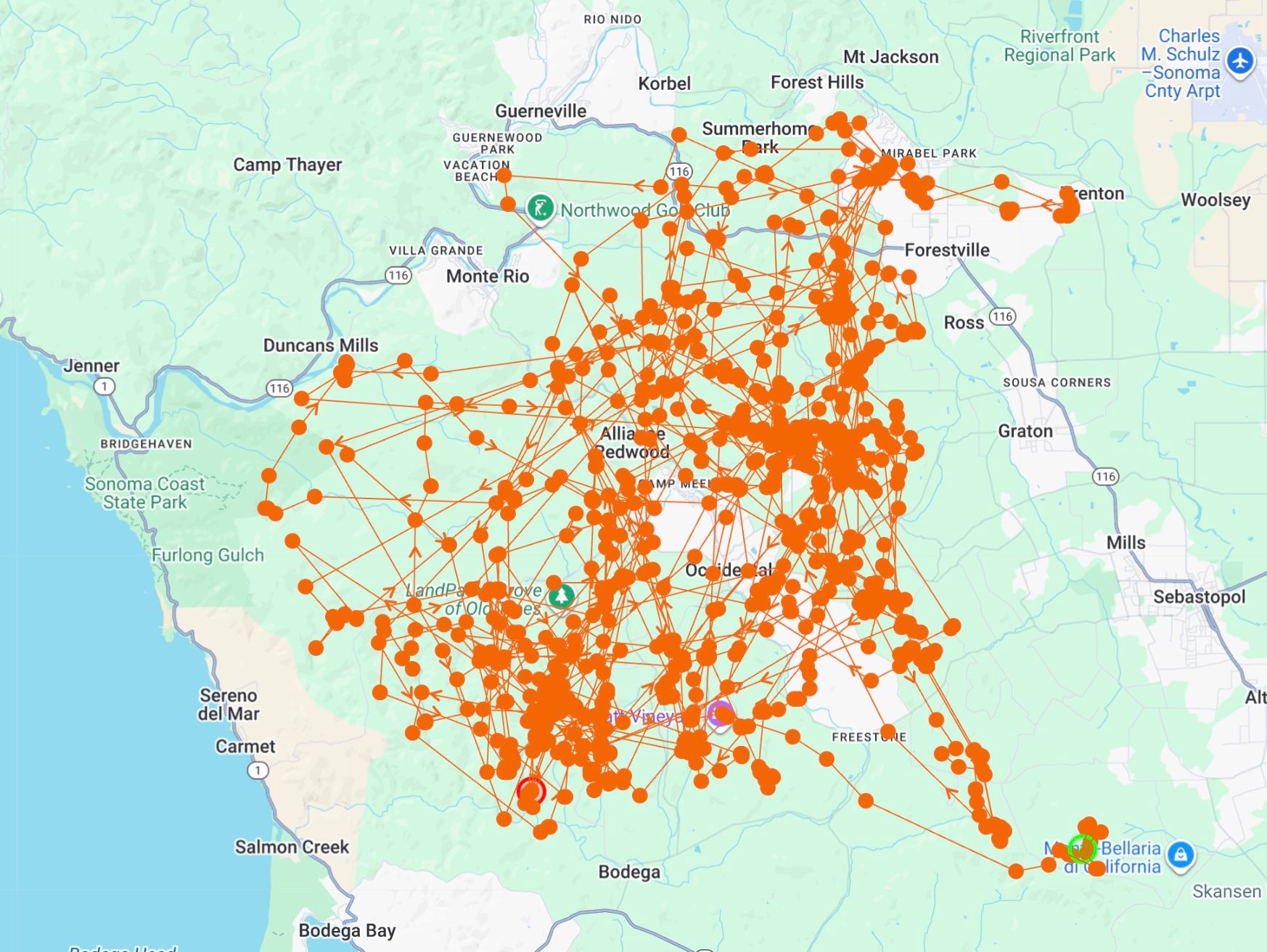 Captured near Forestville, female P49 was captured and collared on the 25 January 2025 after killing a sheep - she had 2 cubs aged 4-5 months with her at the time. Her range is particulalry interesting as it is quite small and spans both sides of the Russian River.
