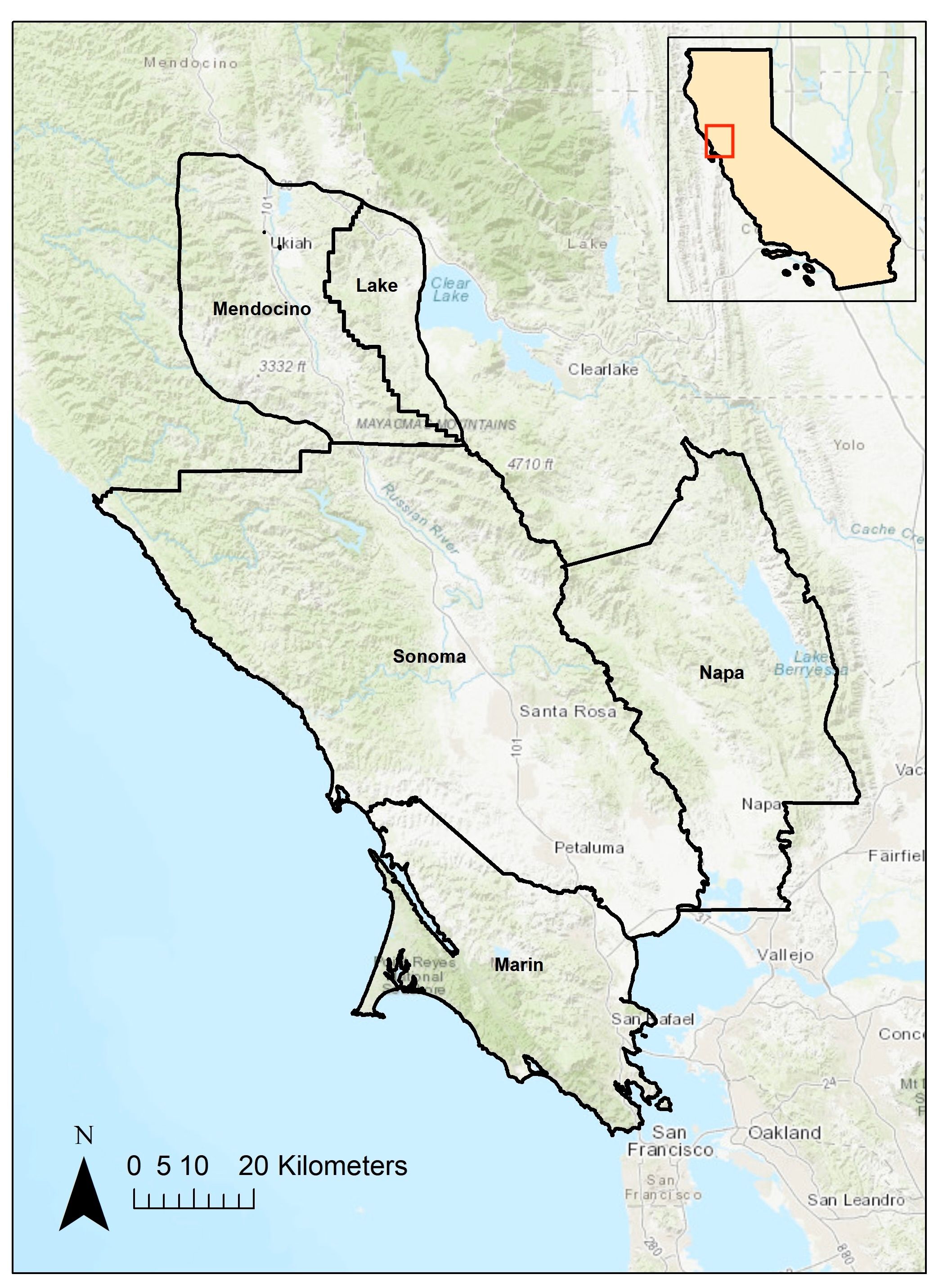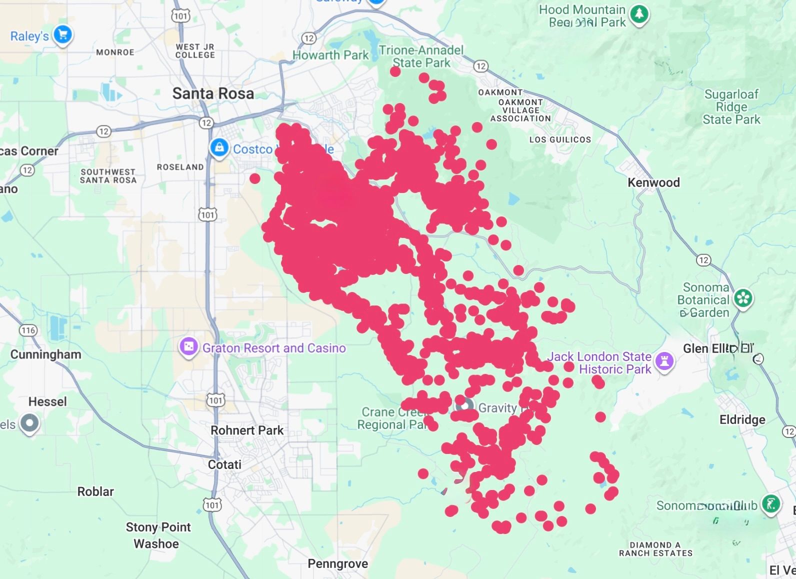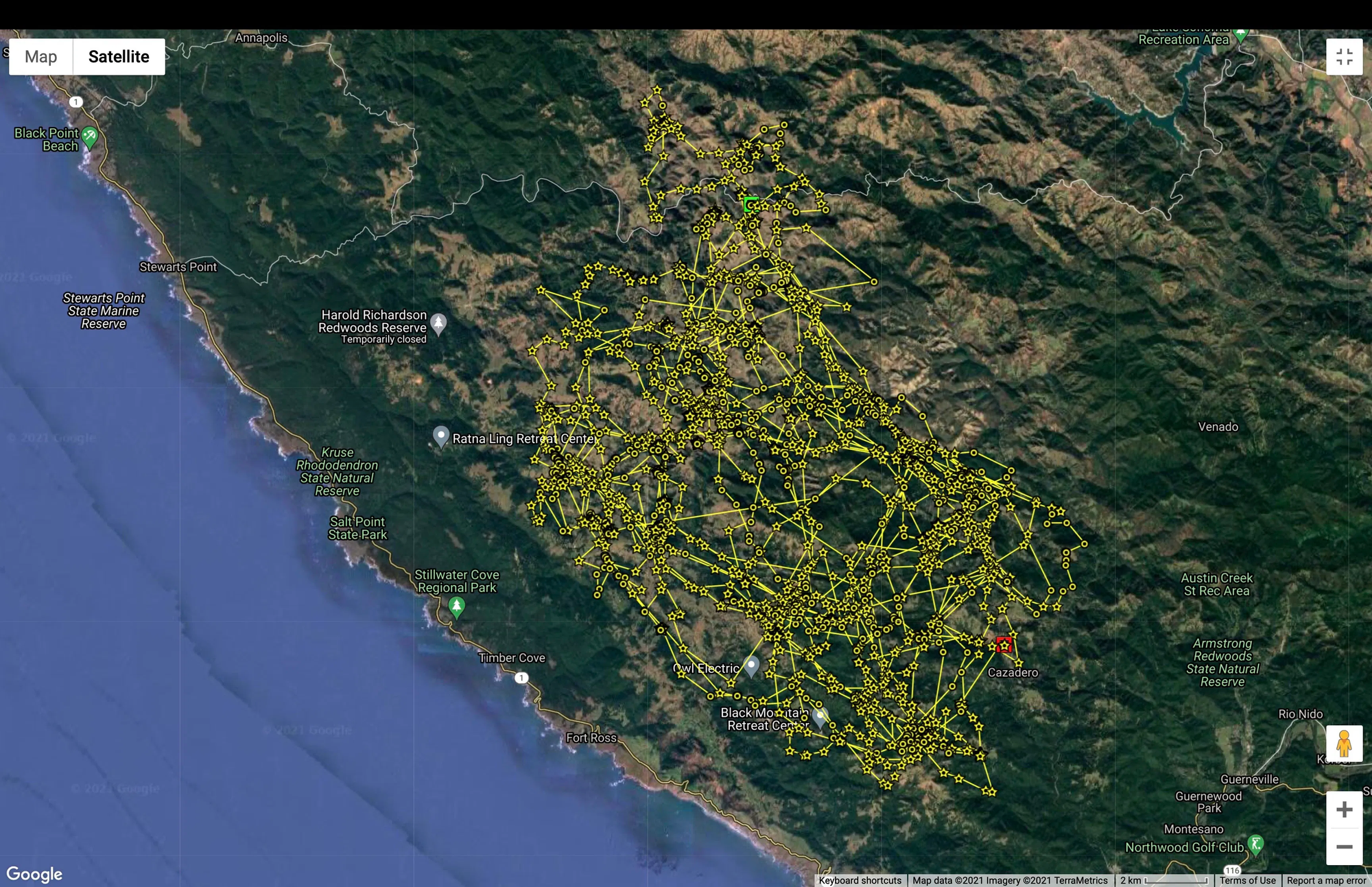 Captured near Forestville, female P49 was captured and collared on the 25 January 2025 after killing a sheep - she had 2 cubs aged 4-5 months with her at the time. Her range is particulalry interesting as it is quite small and spans both sides of the Russian River.