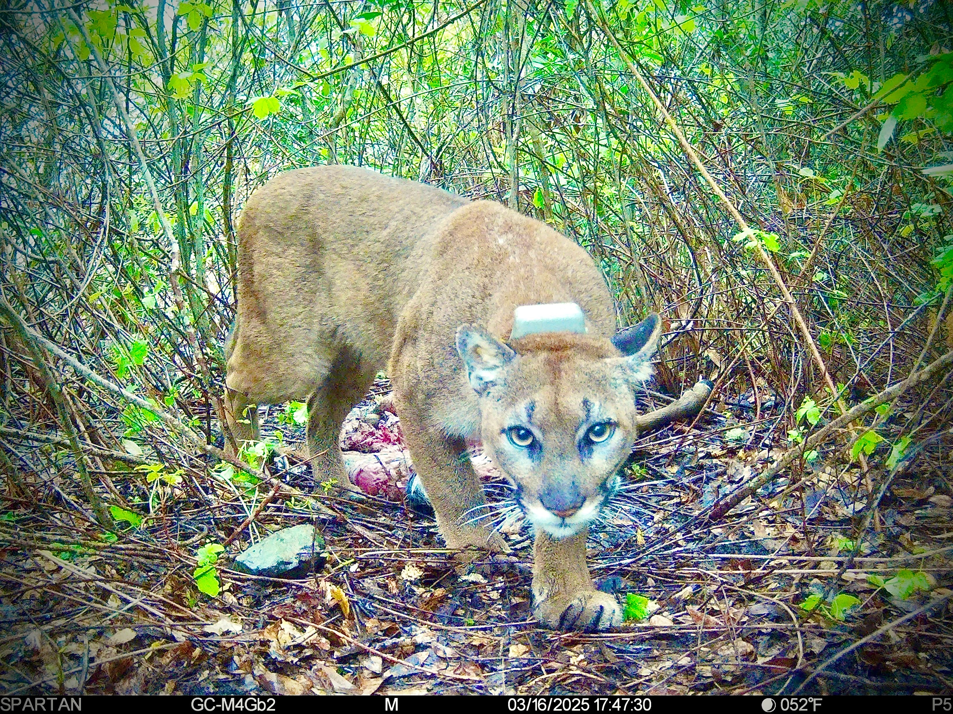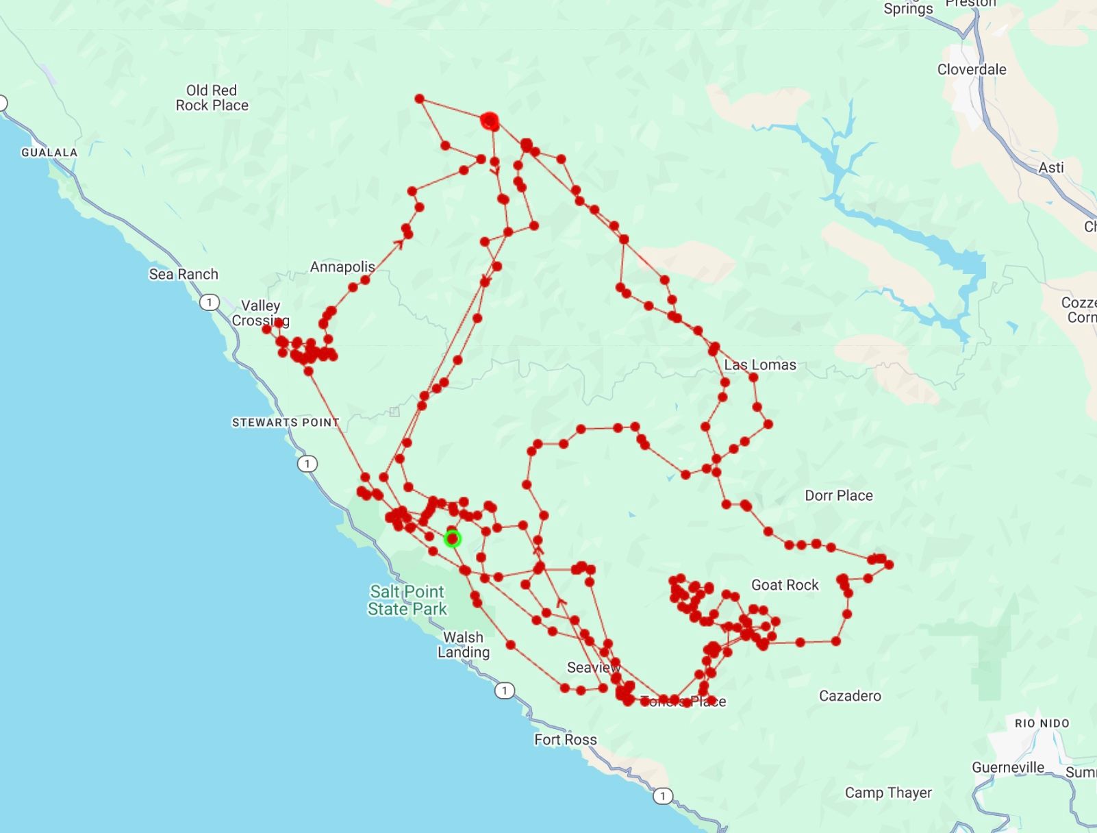 P25 was the territorial male using Cazadero and north of there. He has access to wild boar which he seems to enjoy as part of his diet. Trail camera images near Jenner showed his collar damaged and unable to transmit data.