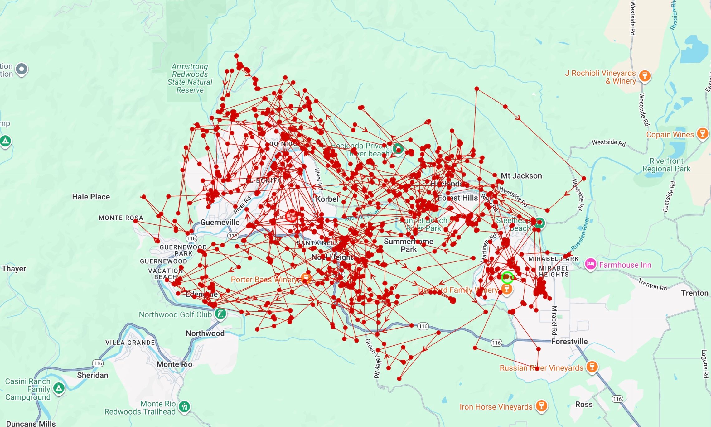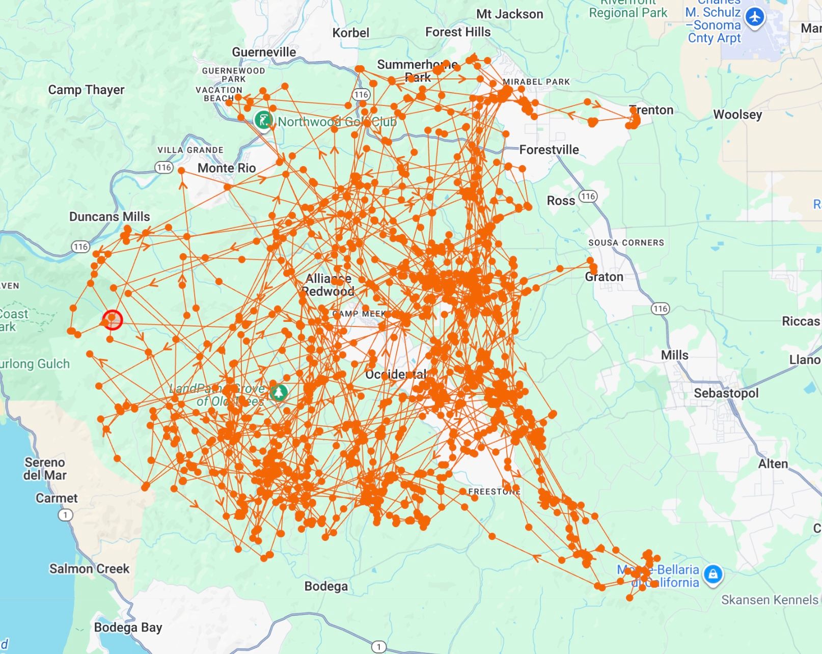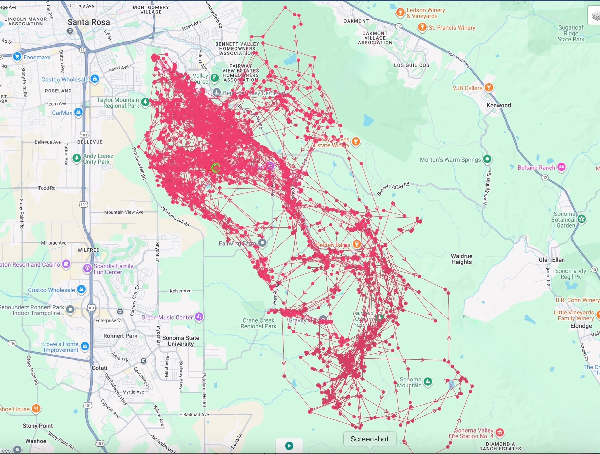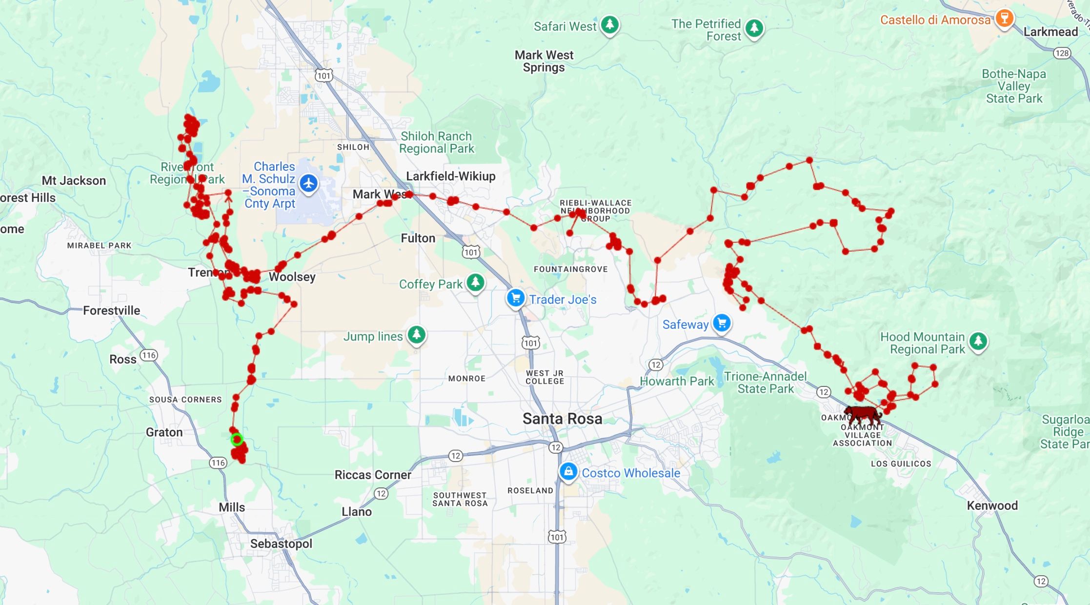 He was not collared very long before he was unfortunately killed by a car on HWY12 in Kenwood. His movements showed classic male dispersal behavior, sticking to sub-optimal habitat, even crossing over the HWY 101.
